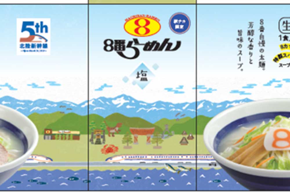 【商品紹介】8番らーめんオリジナルのかまぼこ「8カマ」が加わり、いつもの常温麺シリーズがさらに美味しくなって新登場!北陸を駆ける新幹線を表現したパッケージにもご注目