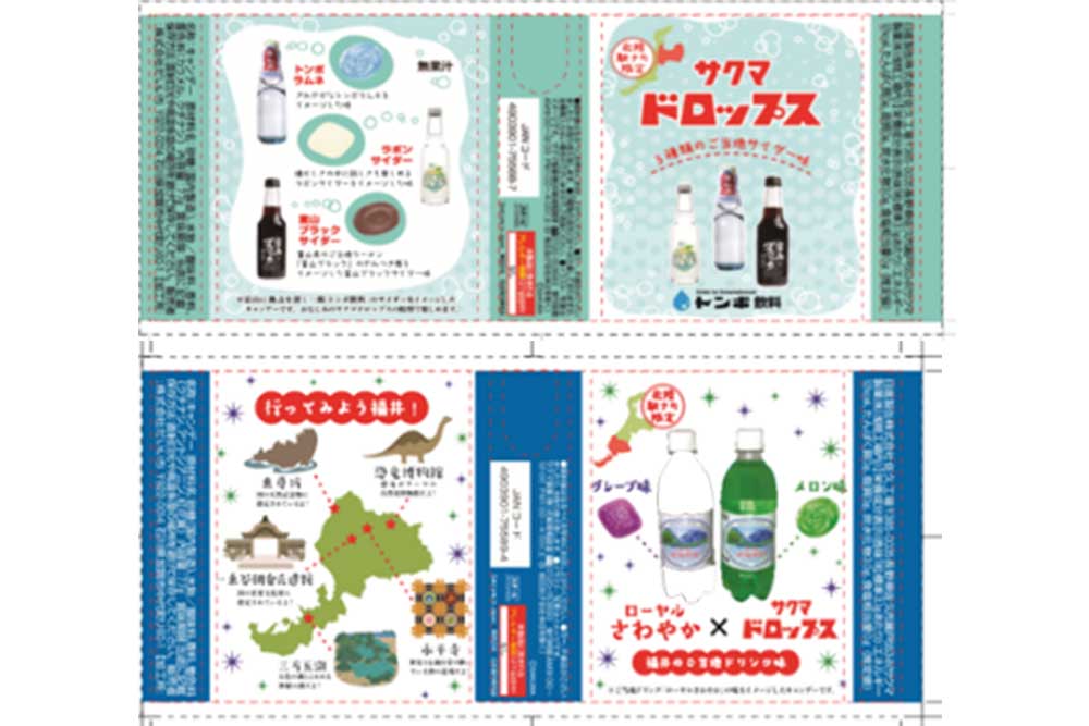 【商品紹介】福井県のご当地ドリンク「ローヤルさわやか」と、富山県のご当地サイダー「トンボラムネ」、「ラボンサイダー」、「富山ブラックサイダー」をそれぞれドロップにしました。