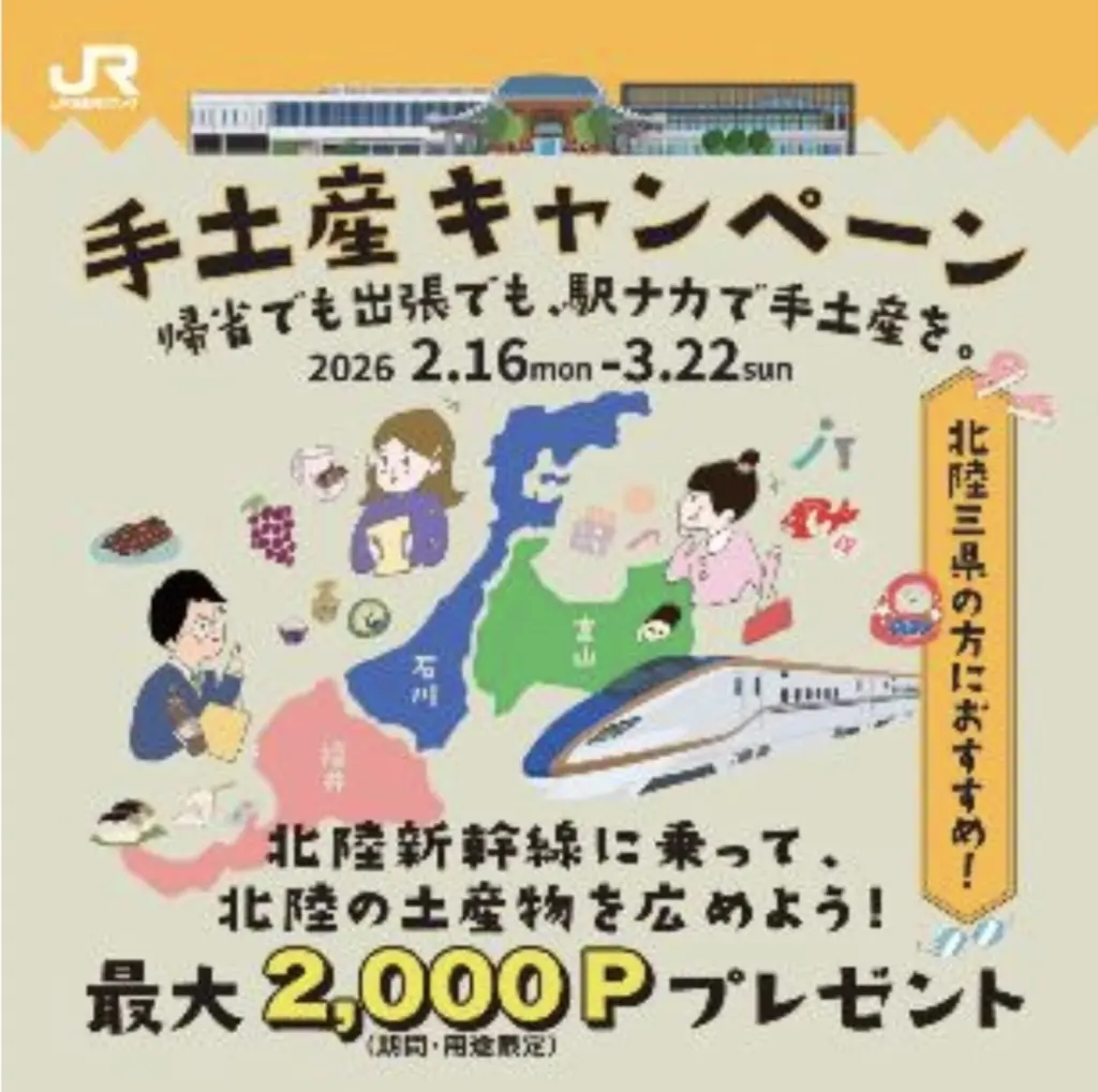 西日本旅客鉄道株式会社(以下、JR西日本)と金沢ターミナル開発株式会社、富山ターミナルビル株式会社、株式会社ジェイアールサービスネット金沢は、北陸の魅力あふれる手土産を、もっと多くの方に知っていただくことを目的に、2026年2月16日より「北陸三県の方におすすめ!手土産キャンペーン」を開催いたします。本キャンペーンでは、条件を達成された方全員にWESTERポイントを最大2,000ポイント還元いたします。